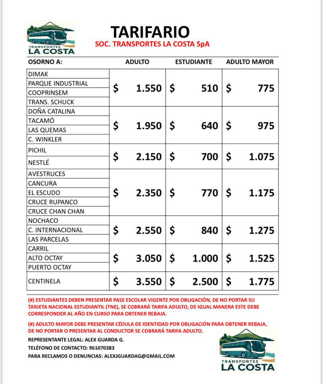 La empresa de transportes Soc. Transportes La Costa SpA ha dado a conocer su nuevo tarifario oficial, el cual entrará en vigencia a partir de mañana, jueves 26 de marzo. El ajuste afecta los traslados desde la ciudad de Osorno hacia diversos puntos intermedios y la localidad de Puerto Octay.